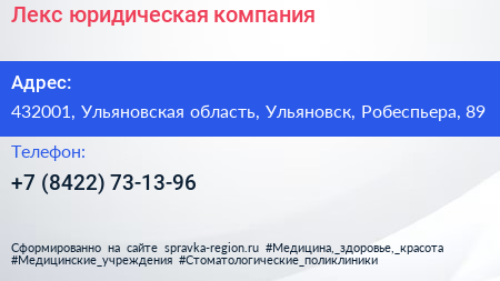 Лекс, юридическая компания по адресу 432001, Ульяновская область, Ульяновск, Робеспьера, 89 в дальнейшем Организация, размещена в следующих категориях: