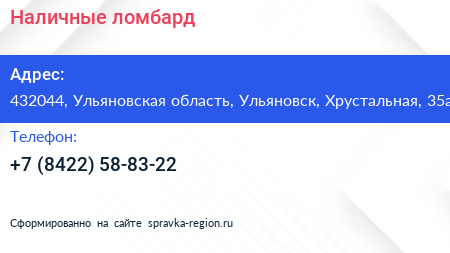 Наличные, ломбард по адресу 432044, Ульяновская область, Ульяновск, Хрустальная, 35а в дальнейшем Организация, размещена в следующих категориях: