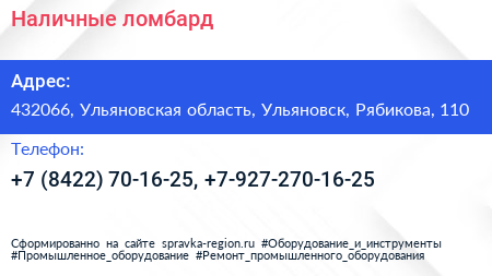 Наличные, ломбард по адресу 432066, Ульяновская область, Ульяновск, Рябикова, 110 в дальнейшем Организация, размещена в следующих категориях: