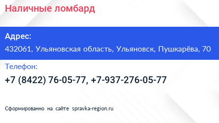 Наличные, ломбард по адресу 432061, Ульяновская область, Ульяновск, Пушкарёва, 70 в дальнейшем Организация, размещена в следующих категориях:
