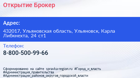 Открытие Брокер по адресу 432017, Ульяновская область, Ульяновск, Карла Либкнехта, 24 ст1 в дальнейшем Организация, размещена в следующих категориях: