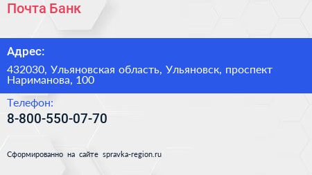 Почта Банк по адресу 432030, Ульяновская область, Ульяновск, проспект Нариманова, 100 в дальнейшем Организация, размещена в следующих категориях: