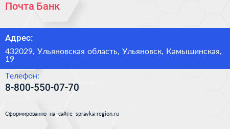 Почта Банк по адресу 432029, Ульяновская область, Ульяновск, Камышинская, 19 в дальнейшем Организация, размещена в следующих категориях: