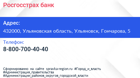 Росгосстрах банк по адресу 432000, Ульяновская область, Ульяновск, Гончарова, 5 в дальнейшем Организация, размещена в следующих категориях: