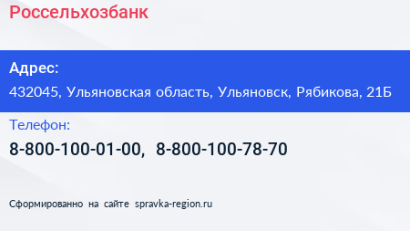 Россельхозбанк по адресу 432045, Ульяновская область, Ульяновск, Рябикова, 21Б в дальнейшем Организация, размещена в следующих категориях: