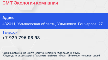 СМТ Экология, компания по адресу 432011, Ульяновская область, Ульяновск, Гончарова, 27 в дальнейшем Организация, размещена в следующих категориях: