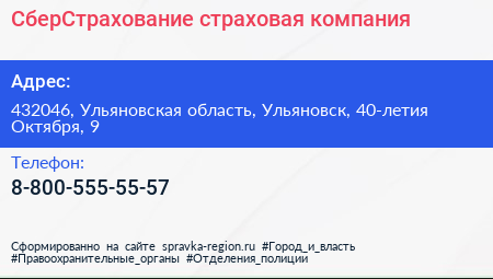 СберСтрахование, страховая компания по адресу 432046, Ульяновская область, Ульяновск, 40-летия Октября, 9 в дальнейшем Организация, размещена в следующих категориях: