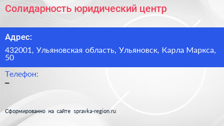 Солидарность, юридический центр по адресу 432001, Ульяновская область, Ульяновск, Карла Маркса, 50 в дальнейшем Организация, размещена в следующих категориях: