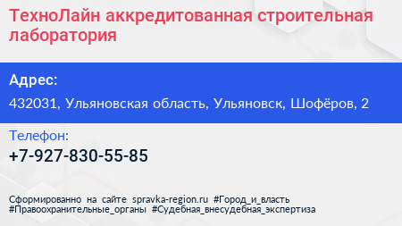 ТехноЛайн, аккредитованная строительная лаборатория по адресу 432031, Ульяновская область, Ульяновск, Шофёров, 2 в дальнейшем Организация, размещена в следующих категориях: