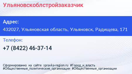 Ульяновскоблстройзаказчик по адресу 432027, Ульяновская область, Ульяновск, Радищева, 171 в дальнейшем Организация, размещена в следующих категориях: