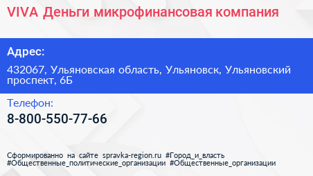 VIVA Деньги, микрофинансовая компания по адресу 432067, Ульяновская область, Ульяновск, Ульяновский проспект, 6Б в дальнейшем Организация, размещена в следующих категориях: