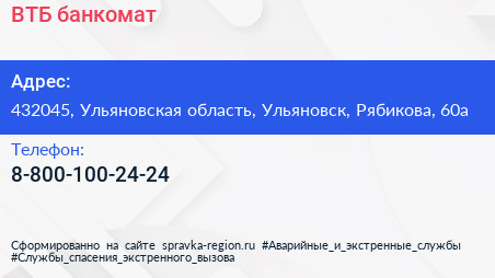 ВТБ, банкомат по адресу 432045, Ульяновская область, Ульяновск, Рябикова, 60а в дальнейшем Организация, размещена в следующих категориях: