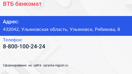 ВТБ, банкомат по адресу 432042, Ульяновская область, Ульяновск, Рябикова, 8 в дальнейшем Организация, размещена в следующих категориях: