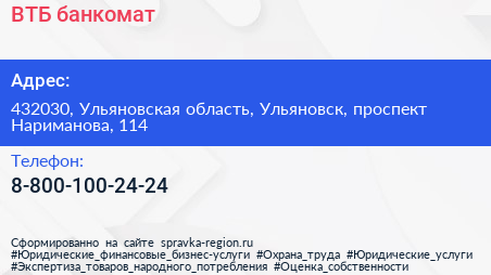 ВТБ, банкомат по адресу 432030, Ульяновская область, Ульяновск, проспект Нариманова, 114 в дальнейшем Организация, размещена в следующих категориях: