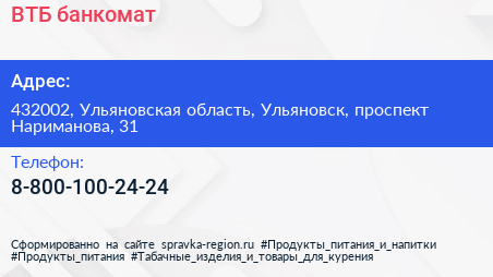 ВТБ, банкомат по адресу 432002, Ульяновская область, Ульяновск, проспект Нариманова, 31 в дальнейшем Организация, размещена в следующих категориях: