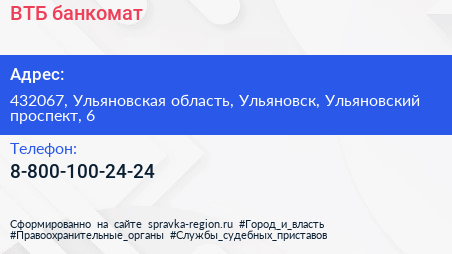 ВТБ, банкомат по адресу 432067, Ульяновская область, Ульяновск, Ульяновский проспект, 6 в дальнейшем Организация, размещена в следующих категориях: