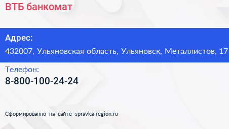 ВТБ, банкомат по адресу 432007, Ульяновская область, Ульяновск, Металлистов, 17 в дальнейшем Организация, размещена в следующих категориях:
