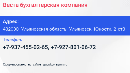 Веста, бухгалтерская компания по адресу 432030, Ульяновская область, Ульяновск, Юности, 2 ст3 в дальнейшем Организация, размещена в следующих категориях: