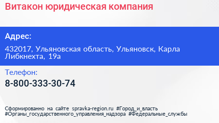 Витакон, юридическая компания по адресу 432017, Ульяновская область, Ульяновск, Карла Либкнехта, 19а в дальнейшем Организация, размещена в следующих категориях:
