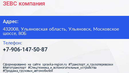 ЗЕВС, компания по адресу 432008, Ульяновская область, Ульяновск, Московское шоссе, 80Б в дальнейшем Организация, размещена в следующих категориях: