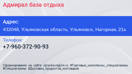 Адмирал, база отдыха по адресу 432048, Ульяновская область, Ульяновск, Нагорная, 21а в дальнейшем Организация, размещена в следующих категориях: