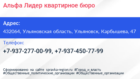 Альфа-Лидер, квартирное бюро по адресу 432064, Ульяновская область, Ульяновск, Карбышева, 47 в дальнейшем Организация, размещена в следующих категориях: