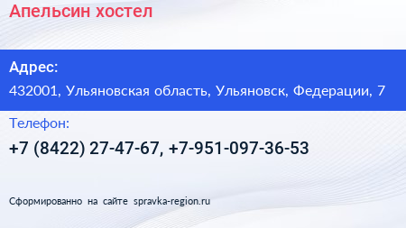 Апельсин, хостел по адресу 432001, Ульяновская область, Ульяновск, Федерации, 7 в дальнейшем Организация, размещена в следующих категориях: