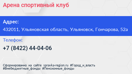 Арена, спортивный клуб по адресу 432011, Ульяновская область, Ульяновск, Гончарова, 52а в дальнейшем Организация, размещена в следующих категориях: