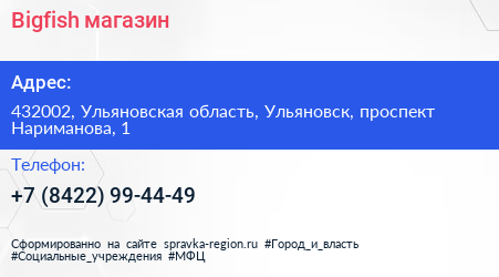 Bigfish, магазин по адресу 432002, Ульяновская область, Ульяновск, проспект Нариманова, 1 в дальнейшем Организация, размещена в следующих категориях: