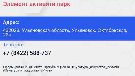 Элемент, активити парк по адресу 432028, Ульяновская область, Ульяновск, Октябрьская, 22а в дальнейшем Организация, размещена в следующих категориях: