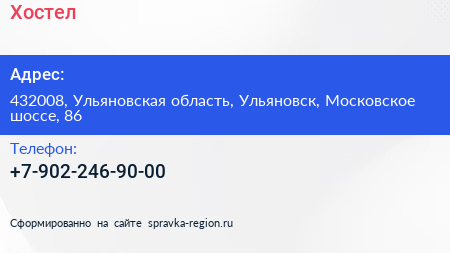 Хостел по адресу 432008, Ульяновская область, Ульяновск, Московское шоссе, 86 в дальнейшем Организация, размещена в следующих категориях: