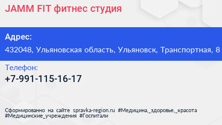 JAMM FIT, фитнес-студия по адресу 432048, Ульяновская область, Ульяновск, Транспортная, 8 в дальнейшем Организация, размещена в следующих категориях: