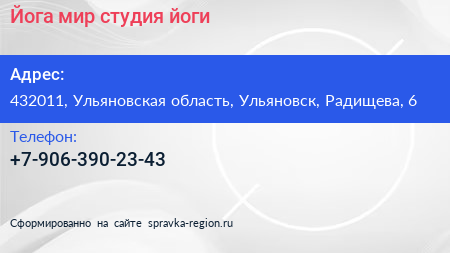 Йога-мир, студия йоги по адресу 432011, Ульяновская область, Ульяновск, Радищева, 6 в дальнейшем Организация, размещена в следующих категориях: