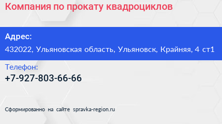Компания по прокату квадроциклов по адресу 432022, Ульяновская область, Ульяновск, Крайняя, 4 ст1 в дальнейшем Организация, размещена в следующих категориях: