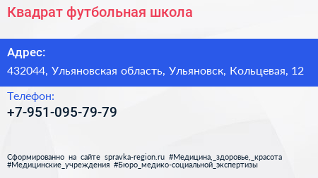 Квадрат, футбольная школа по адресу 432044, Ульяновская область, Ульяновск, Кольцевая, 12 в дальнейшем Организация, размещена в следующих категориях: