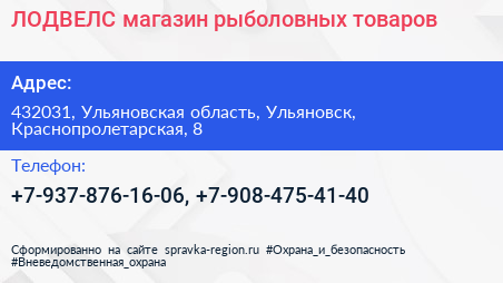 ЛОДВЕЛС, магазин рыболовных товаров по адресу 432031, Ульяновская область, Ульяновск, Краснопролетарская, 8 в дальнейшем Организация, размещена в следующих категориях: