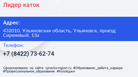 Лидер, каток по адресу 432010, Ульяновская область, Ульяновск, проезд Сиреневый, 13а в дальнейшем Организация, размещена в следующих категориях: