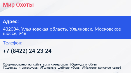 Мир Охоты по адресу 432034, Ульяновская область, Ульяновск, Московское шоссе, 94в в дальнейшем Организация, размещена в следующих категориях: