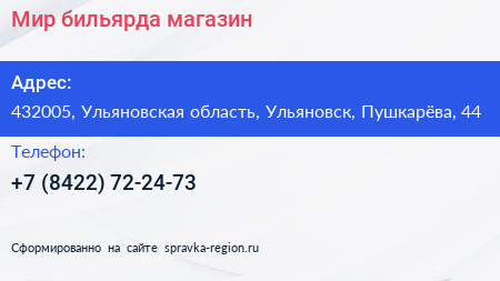 Мир бильярда, магазин по адресу 432005, Ульяновская область, Ульяновск, Пушкарёва, 44 в дальнейшем Организация, размещена в следующих категориях: