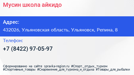 Муcин, школа айкидо по адресу 432026, Ульяновская область, Ульяновск, Репина, 8 в дальнейшем Организация, размещена в следующих категориях: