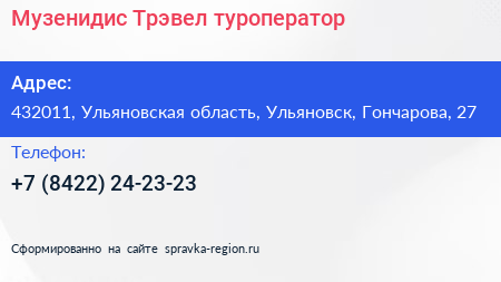 Музенидис Трэвел, туроператор по адресу 432011, Ульяновская область, Ульяновск, Гончарова, 27 в дальнейшем Организация, размещена в следующих категориях: