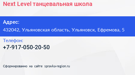 Next Level, танцевальная школа по адресу 432042, Ульяновская область, Ульяновск, Ефремова, 5 в дальнейшем Организация, размещена в следующих категориях: