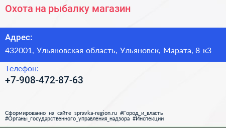 Охота на рыбалку, магазин по адресу 432001, Ульяновская область, Ульяновск, Марата, 8 к3 в дальнейшем Организация, размещена в следующих категориях: