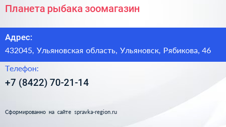 Планета рыбака, зоомагазин по адресу 432045, Ульяновская область, Ульяновск, Рябикова, 46 в дальнейшем Организация, размещена в следующих категориях: