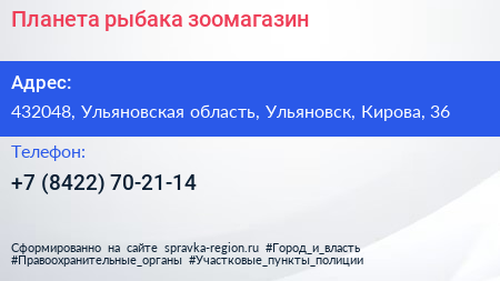 Планета рыбака, зоомагазин по адресу 432048, Ульяновская область, Ульяновск, Кирова, 36 в дальнейшем Организация, размещена в следующих категориях: