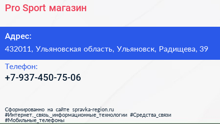 Pro Sport, магазин по адресу 432011, Ульяновская область, Ульяновск, Радищева, 39 в дальнейшем Организация, размещена в следующих категориях: