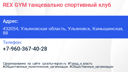 REX GYM, танцевально-спортивный клуб по адресу 432054, Ульяновская область, Ульяновск, Камышинская, 88 в дальнейшем Организация, размещена в следующих категориях: