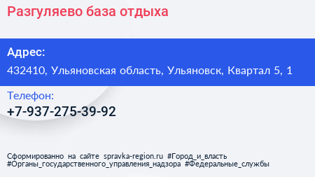 Разгуляево, база отдыха по адресу 432410, Ульяновская область, Ульяновск, Квартал 5, 1 в дальнейшем Организация, размещена в следующих категориях: