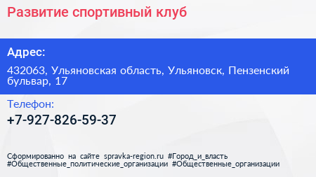Развитие, спортивный клуб по адресу 432063, Ульяновская область, Ульяновск, Пензенский бульвар, 17 в дальнейшем Организация, размещена в следующих категориях: