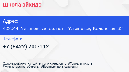 Школа айкидо по адресу 432044, Ульяновская область, Ульяновск, Кольцевая, 32 в дальнейшем Организация, размещена в следующих категориях: